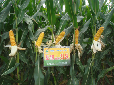 特征特性:該品種為早熟品種,夏播生育期95天,活稈成熟。 株型緊湊,株高250cm,穗位100cm左右,穗長(zhǎng)20cm 左右,穗粗5.0cm左右,穗行數(shù)16行。白軸,半硬粒型,軸細(xì)粒深,出籽率90%以上。