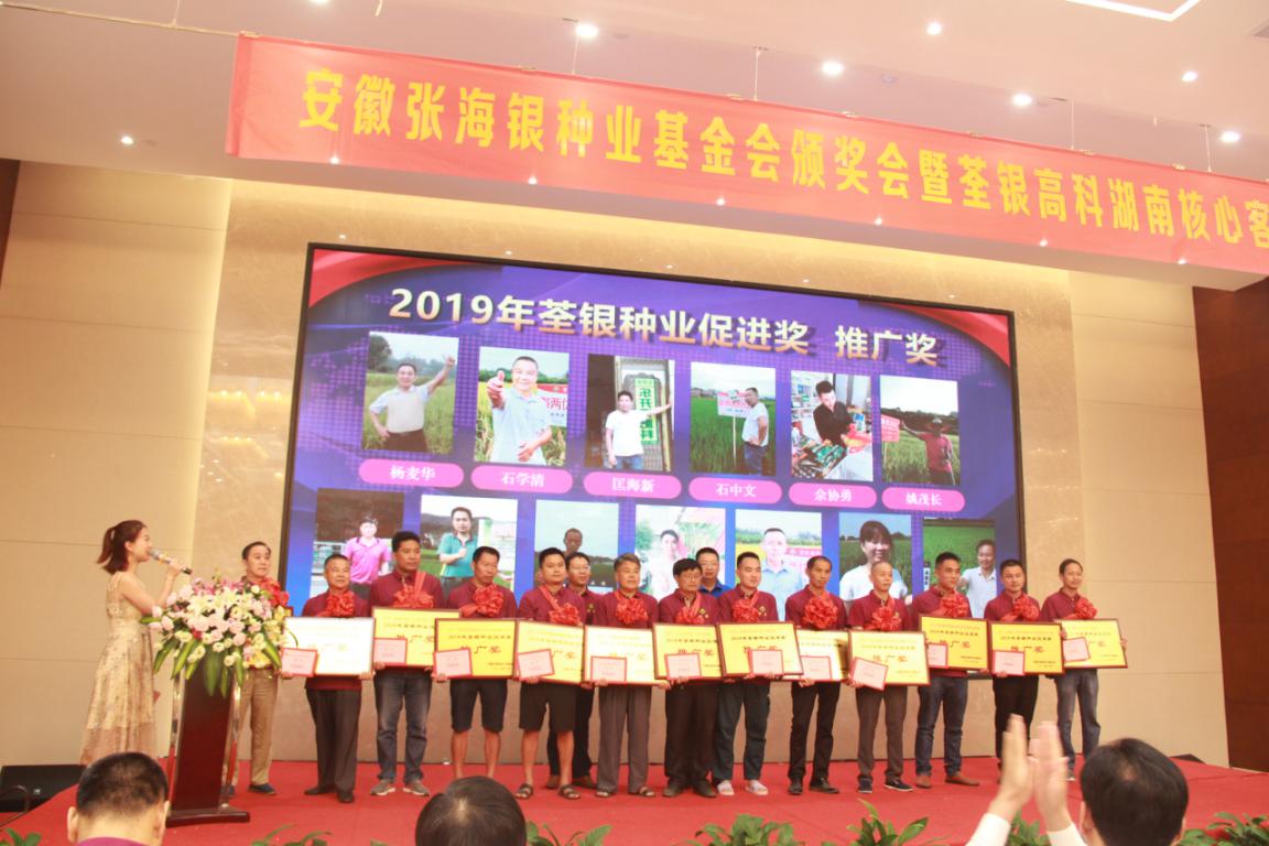 ??? 2019年8月3-4日,安徽荃銀高科湖南營銷公司核心客戶研討峰會暨張海銀種業(yè)基金會荃銀種業(yè)促進(jìn)獎頒獎儀式在湖南長沙隆重召開。湖南省種子管理站站長李穩(wěn)香、湖南省種子協(xié)會副會長兼秘書長閔軍、安徽荃銀高科種業(yè)股份有限公司常務(wù)副總經(jīng)理、營銷總監(jiān)王玉林、安徽張海銀種業(yè)基金會秘書長張彤、荃銀高科監(jiān)事會主席謝慶軍、荃銀高科工會主席鄭滿生、中化現(xiàn)代農(nóng)業(yè)MAP事業(yè)部技術(shù)總監(jiān)徐伯陽、中化MAP糧作部、中化化肥、先正達(dá)各省區(qū)的總經(jīng)理和荃銀高科分子公司等單位領(lǐng)導(dǎo)以及來自湖南省的160多位種業(yè)精英們參會。