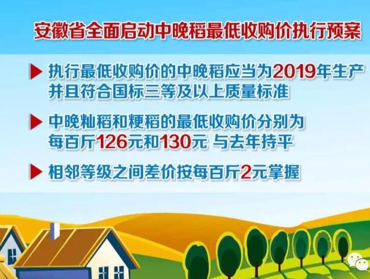 ??? 近日,從省政府新聞辦舉行的新聞發(fā)布會(huì)上了解到,從現(xiàn)在開始到2020年1月31號,安徽省全面啟動(dòng)中晚稻最低收購價(jià)執(zhí)行預(yù)案,執(zhí)行最低收購價(jià)的中晚稻應(yīng)當(dāng)為2019年生產(chǎn)并且符合國標(biāo)三等及以上質(zhì)量標(biāo)準(zhǔn),中晚秈稻和粳稻的最低收購價(jià)分別為每百斤126元和130元,與去年持平,相鄰等級之間差價(jià)按每百斤2元掌握。