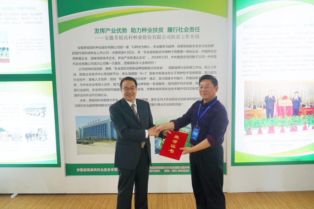 ??? 10月17日是第六個全國扶貧日,民政部社會組織管理局在安徽合肥舉行全國性糧農(nóng)類社會組織產(chǎn)業(yè)扶貧對接活動暨第十七屆中國國際糧油產(chǎn)品及設(shè)備技術(shù)展示交易會。民政部黨組成員、副部長詹成付,安徽省人民政府常務(wù)副省長鄧向陽,國家糧食和物資儲備局副局長韓衛(wèi)江等領(lǐng)導(dǎo)出席開幕式。在中國種子協(xié)會的支持與推薦下,荃銀高科參與本次全國性糧農(nóng)類社會組織產(chǎn)業(yè)扶貧對接活動并獲頒證書。